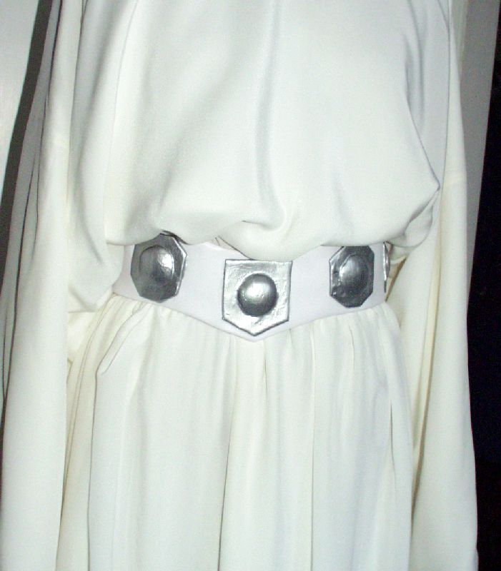 Ich habe eine Weile gebraucht, bis ich schöne Knöpfe für den Verschluß am hinteren Nacken gefunden hatte, die ich unbedingt passend zum Gürtel haben wollte – und irgendwie habe ich das dann auch geschafft. Man sieht diese Knöpfe auf dem Bild oben und auch auf einem Bild auf Mohmoh’s Cosplay-Seite sehr gut. Der Verschluß am Originalkleid ist soweit mir bekannt ist, nie sichtbar, da sich Leia’s Haar immer darüber befindet.