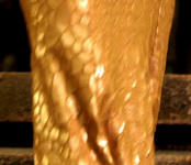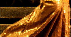 It seems to be made from aged black leather, painted with gold. The decorations on her bodice could be real metal motifs that were sewn on, metal flakes that were glued to it or they could simply be painted on (which I doubt, because there seems to be a structure in them).