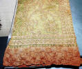 Red satin, couched and embroidered with silver, silver-gilt and colored silk threads, trimmed with silver gilt and silk thread fringe and tassel, lined with pink linen, now faded