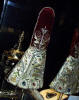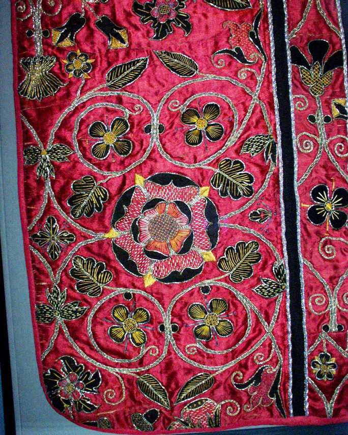 Crimson velvet, white satin, embroidered with silver gilt thread, colored silks, beads, and spangles.
